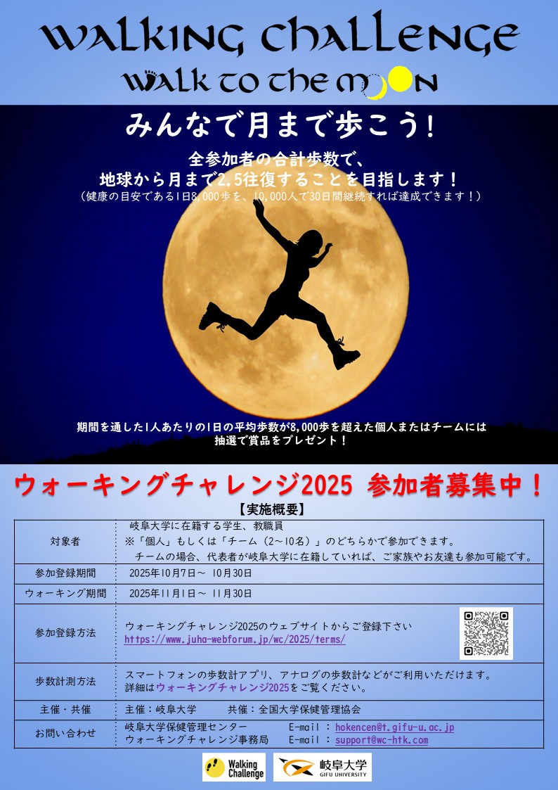 岐阜大学保健管理センターから、学生・教職員のみなさまの健康づくりの一環としてウォーキングを推進する企画「みんなで月まで歩こう!ウォーキングチャレンジ2025」のご案内です。