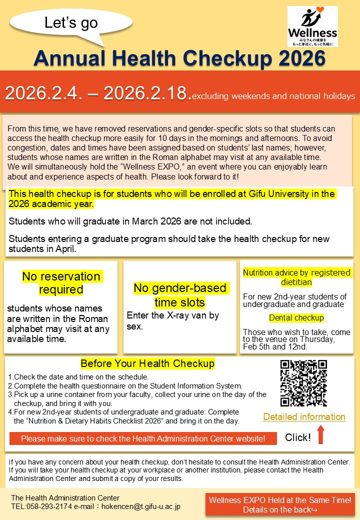 To avoid congestion, specific dates and times have been assigned based on students’ family names. However, whose names start with a letter of alphabet may take the checkup at a time that is convenient for them. There are opportunities to attend in both the morning and afternoon over a 10-day period. See page 3 of “Information on the AY 2026 Annual Health Checkup for Current Students.”